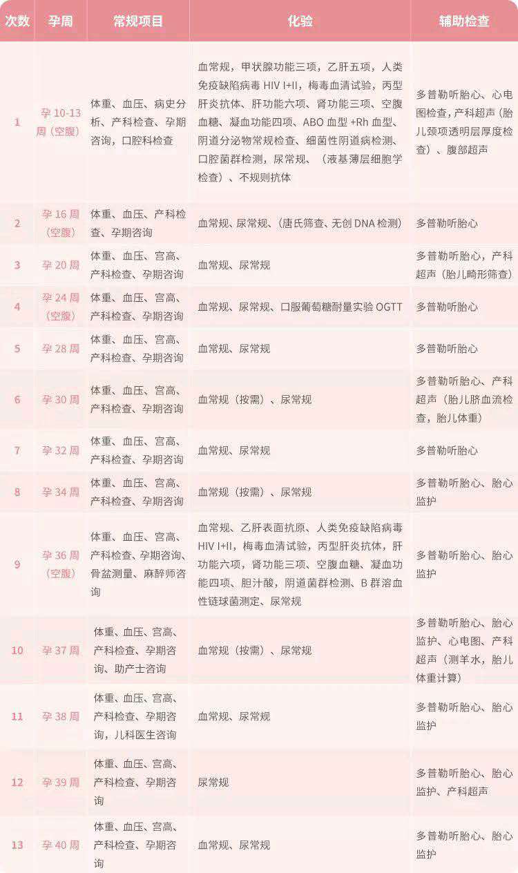 一般情況下,整個(gè)孕期準(zhǔn)媽媽大約需要進(jìn)行13次以上的產(chǎn)檢,每個(gè)時(shí)期關(guān)注的重點(diǎn)也是不一樣的。